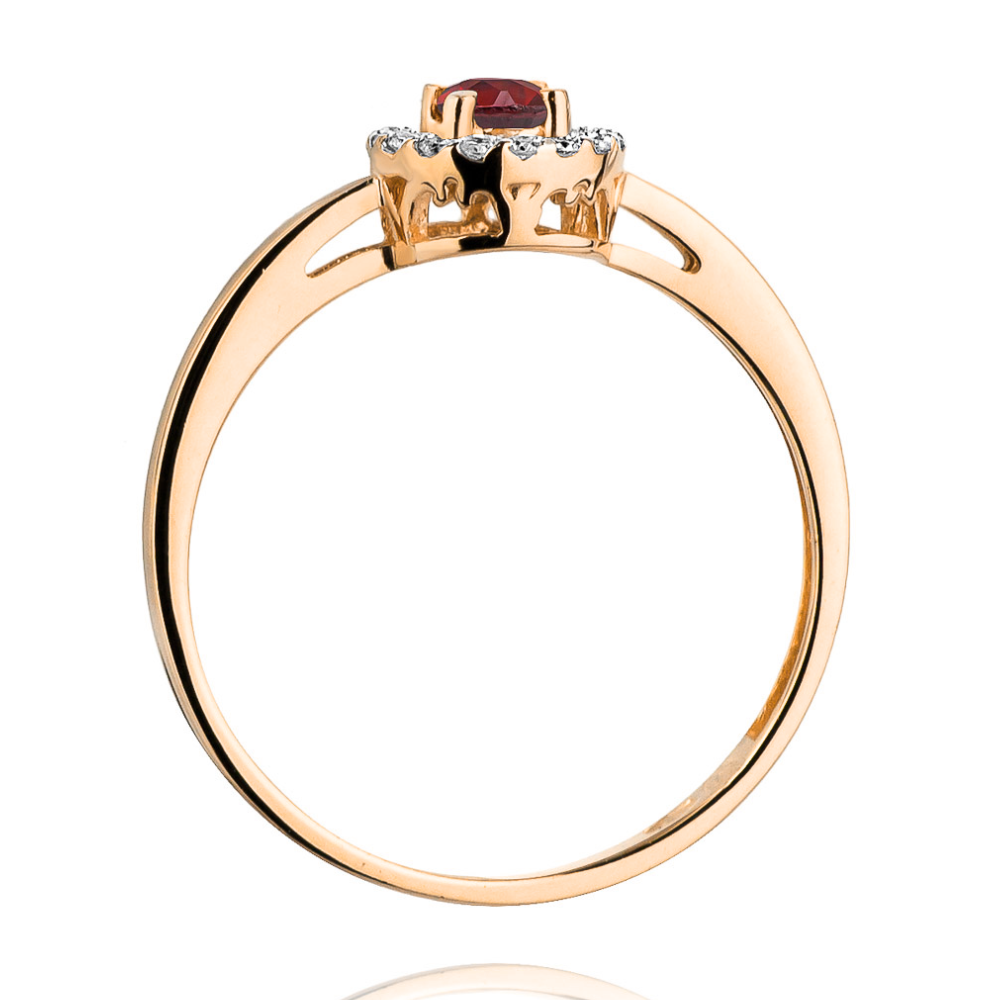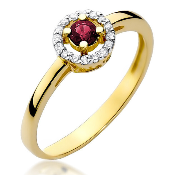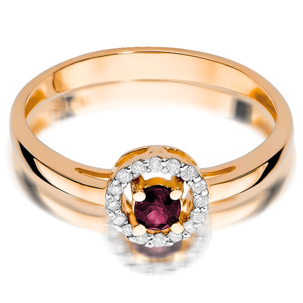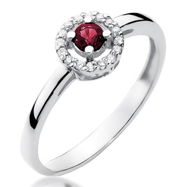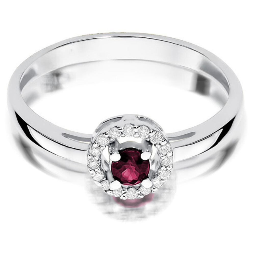 Halo sužadėtuvių žiedas su rubinu ir deimantais. Rubinas 0,15 karato centre, deimantai sudėti aplink rubiną. Išskirtinis žiedas – stilingai moteriai. Puikiai tinka sužadėtuvėms ir kasdienai, suteikia prabangą jūsų stilui.