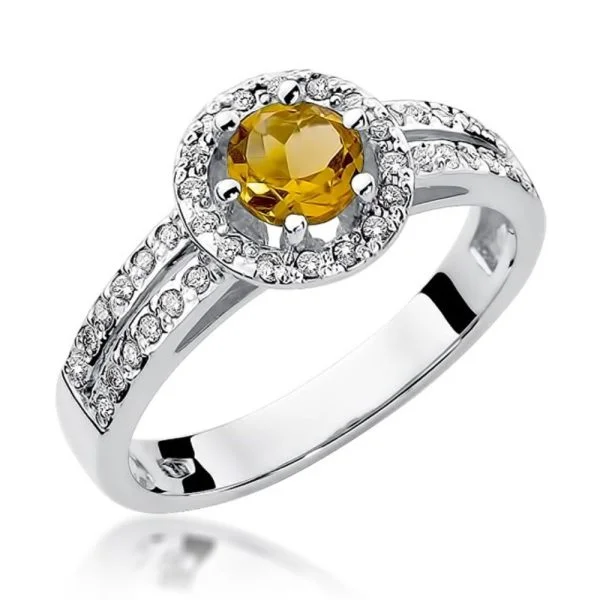 Luxurious Halo design: a round citrine surrounded by sparkling diamonds, featuring a double-row band adorned with diamonds. Ideal for engagements, daily wear, and special occasions, adding a touch of luxury to your style.
