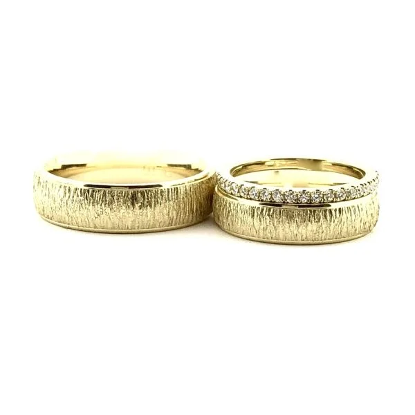 Wide, handcrafted rings with a textured surface combine classic style and originality. A separate third women’s wedding ring with diamonds (0.20 ct) – a row of gemstones creates an impression of luxury. Wedding rings for Him and Her.
