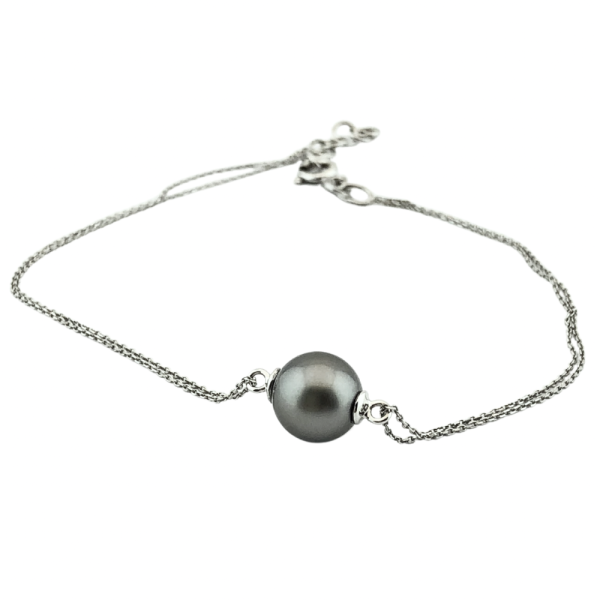 Balto aukso apyrankė su juodu jūriniu perlu. Unikalus apyrankės dizainas kasdienai ir ypatingoms progoms.