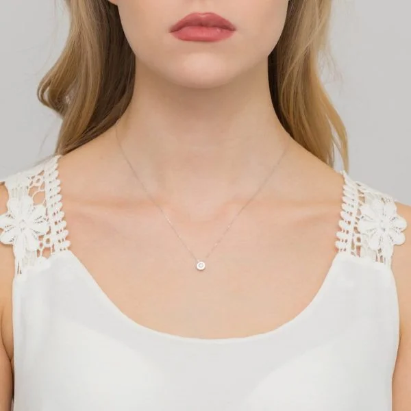 Minimalist design white gold pendant with a diamond, distinguished by its refined character. This is a piece of jewelry that adds a special glow to any look, symbolizes eternal value, and becomes an exclusive detail suitable for both daily wear and special occasions.