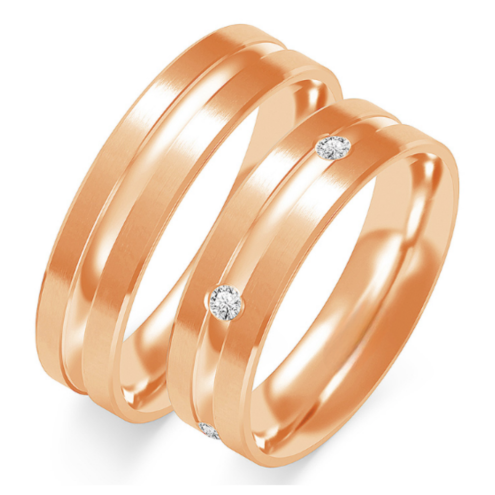 Nepakartojamo grožio vestuviniai žiedai išskirtinio stiliaus, aukštos kokybės, su komforto zona. Puikus pasirinkimas, atspindintis jūsų meilės istoriją. Jų technologija išsiskiria – vestuviniai žiedai gaminami iš grūdinto aukso, kuris atsparus mikro įtrūkimams, neturi sudėtyje nikelio bei mažiau braižosi. Žiedai gali būti pagamintas pagal užsakymą: raudono, geltono bei balto aukso, už papildomą mokestį su kitos aukso spalvos krašteliais, skirtingu žiedo pločių arba su deimantais.