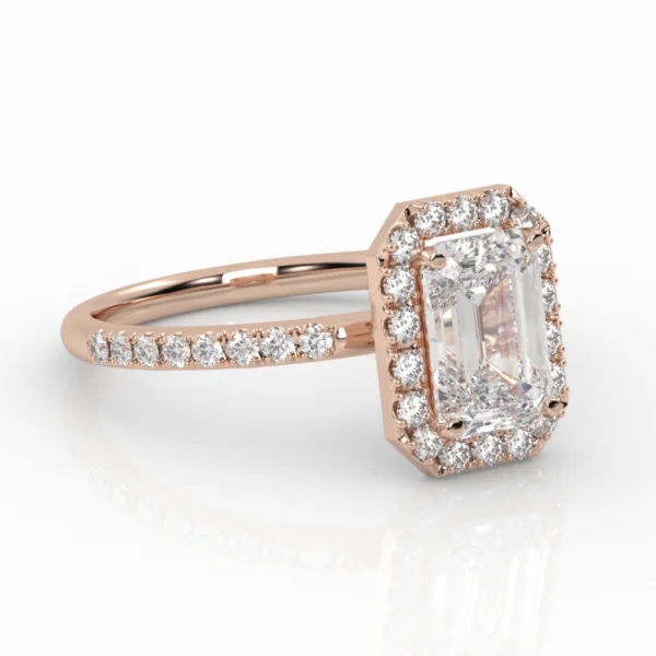 Punast kullast sõrmus 0,30 ct smaragdilõikega teemandiga, mida ümbritsevad säravad teemandid, ning rafineeritud teemantidega kaunistatud sõrmuseosaga. Suurepärane Halo-disain, mis paneb teie käe õitsva kaunidusega särama!