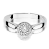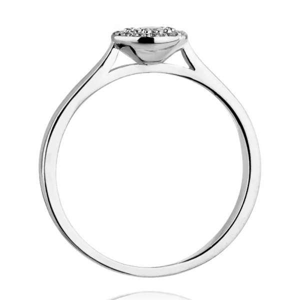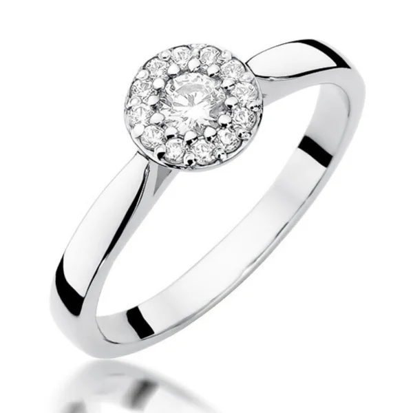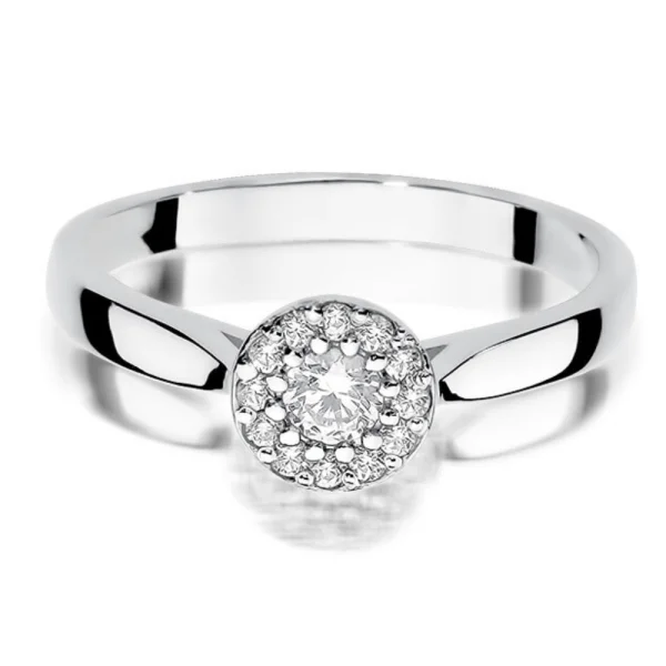 Balto aukso sužadėtuvių žiedas su deimantu, apsuptu mažų akmenų vainiku. Halo dizainas simbolizuoja šviesą ir džiaugsmą, o bendras 0,22 ct svoris suteikia papuošalui ypatingo spindesio.