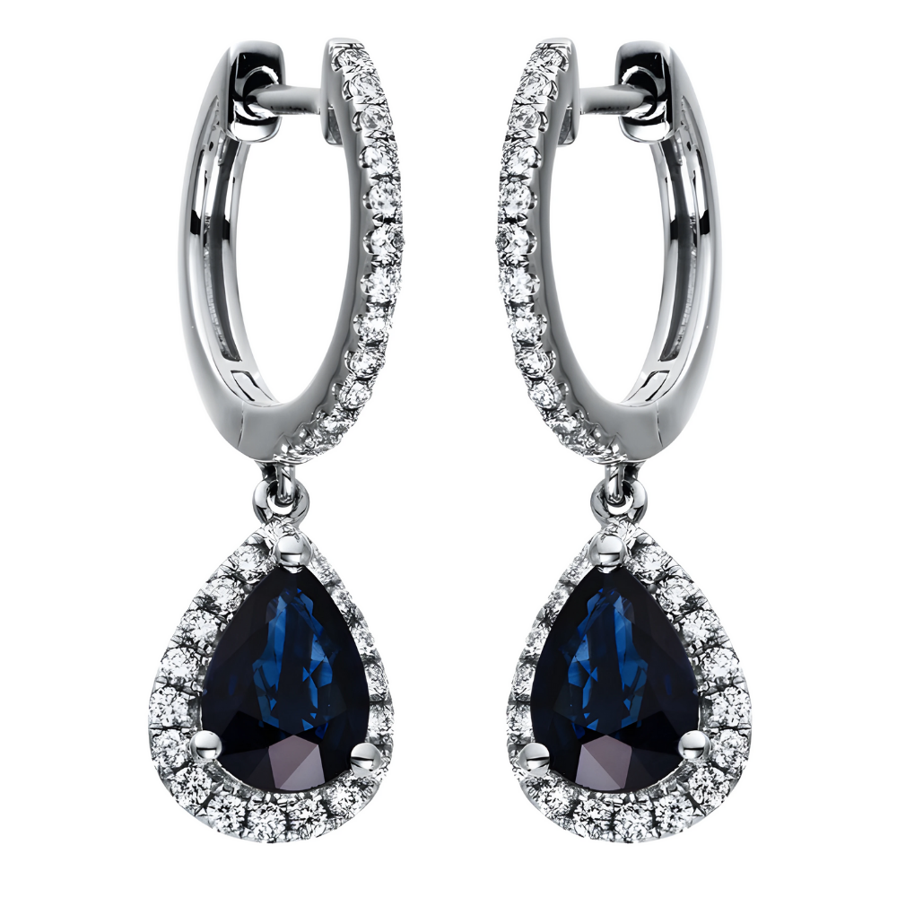 Klasikinio dizaino auksiniai auskarai su anglišku užsiegimu su safyrais lašo formos 1.72 karato ir deimantais aplink safyrą. Tinka kasdienai ir ypatingoms progoms, išskirtinam stiliui.