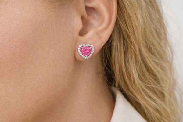 Šiame modelyje pasirinktas halo dizainas, kuris subtiliai pabrėžia širdelės formos rožinio turmalino spindesį ir suteikia auskarams papildomos prabangos bei romantikos. Smulkūs deimantai elegantiškai įrėmina centrinį akmenį, sustiprindami šviesos žaismą, o pats brangakmenis – rožinis turmalinas – tampa pagrindiniu kompozicijos akcentu. Šis akmuo dažnai siejamas su meile, švelnumu, emociniu balansu ir vidine harmonija.