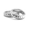 Originalūs, modernūs auksiniai vestuviniai žiedai. Labiausiai žavi žiedų paviršius, turintis daug įdubimų, sukuriantis porėto paviršiaus įspūdį. Šie vestuviniai žiedai tiks jaunavedžiams, norintiems išskirtinių žiedų. Įmantrus sprendimas – briliantų eilutė eina ne per moteriško žiedo centrą, kaip įprasta, bet šone.