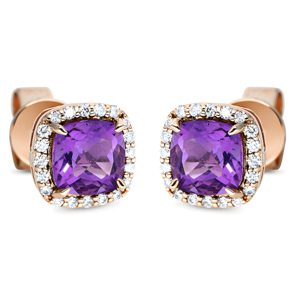 Moderniaus dizaino auksiniai auskarai vinukai su ametistais pagalvėlės formos ir deimantais aplink ametistą. Tinka kasdien ir ypatingoms progoms, išskirtinam stiliui.