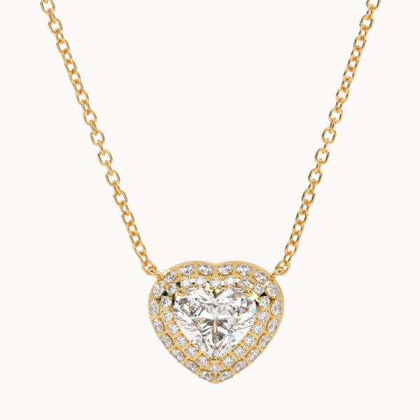 Leiskite savo žvaigždėm spinduliuoti su geltono aukso grandinėle ir Halo dizaino prabangiu žaižaruojančiu pakabuku. 0,50 ct Širdelės formos deimantas apsuptas keliomis eilėmis smulkių deimantų (0,24 ct), suteikiant ypatingą žavesį jūsų akimis ir ypatingoms progoms.