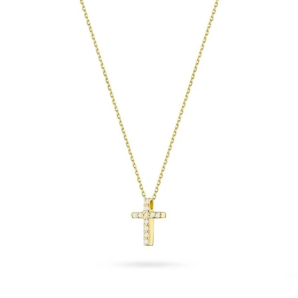 Geltono aukso kryželis su deimantais (0,06 ct), spindintis elegancija ir prasminga simbolika.