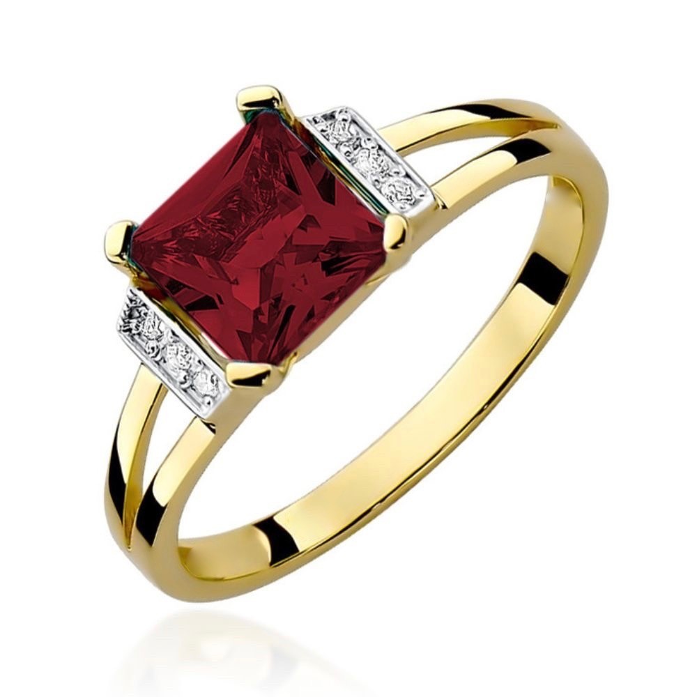 Dzeltenā zelta gredzens ar taisnstūra formas granātu un dimantiem. Granāts centrā, dimanti izvietoti abās pusēs. Lieliski piemērots saderināšanai un ikdienai, piešķirot greznuma akcentu jūsu stilam.