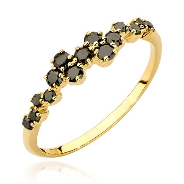 Elegantiškas geltono aukso žiedas su juodais deimantais. Modernus dizainas, kai skirtingo dydžio deimantai sudėti kaip haotiškos eilutę, sukuriant įspūdingą efektą. Puikus pasirinkimas sužadėtuvėms ir ypatingoms progoms.