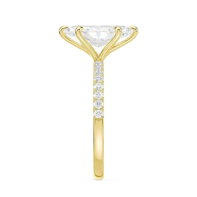 Markizės formos deimantas nėra pasirinkimas minimalizmui — jis yra skirtas tiems, kurie nori ypatingos formos. Tai dizainas, kuris ne demonstruoja prabangą, o ją išgrynina per proporciją ir švelnų kontūro dramatizmą.