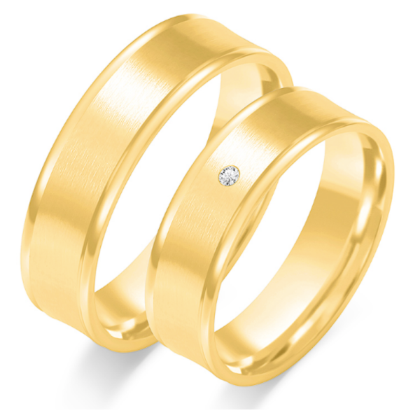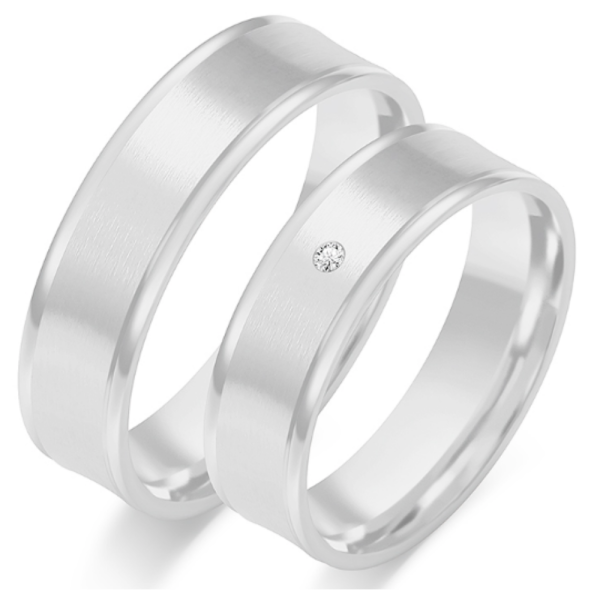 Platūs vestuviniai žiedai, rankų darbo su švelniu matiniu paviršiumi. Moteriškas žiedas puoštas blizgančiais deimantais, o žiedų plotis siekia 6 mm. Abu turi komforto zoną, užtikrinančią jūsų patogumą. Tai išskirtiniai vestuviniai žiedai, kurie praturtins jūsų gyvenimą ilgam.