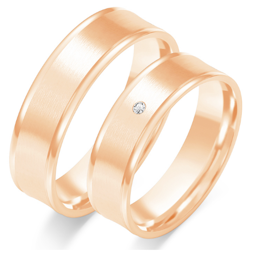 Platūs vestuviniai žiedai, rankų darbo su švelniu matiniu paviršiumi. Moteriškas žiedas puoštas blizgančiais deimantais, o žiedų plotis siekia 6 mm. Abu turi komforto zoną, užtikrinančią jūsų patogumą. Tai išskirtiniai vestuviniai žiedai, kurie praturtins jūsų gyvenimą ilgam.