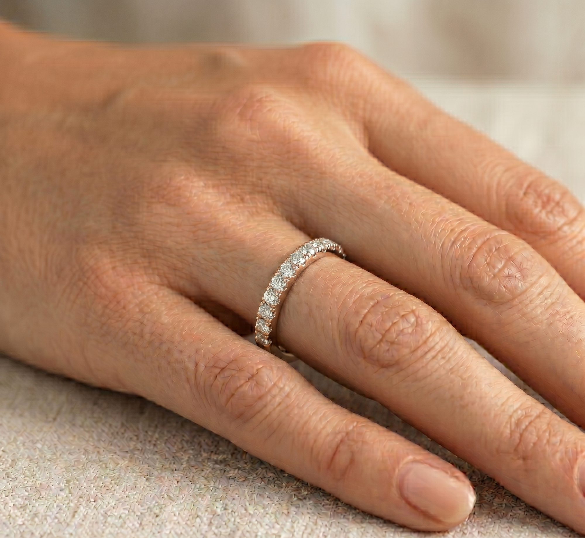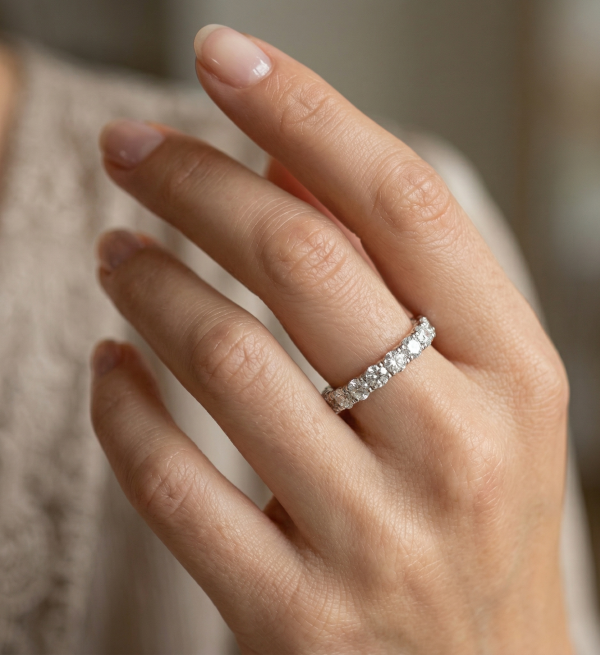 Deimantinė juostelė su deimantais – žiedas su 0.75 karato deimantais. Nesvarbu, ar jau turite sužadėtuvių žiedą, ar vestuvinį žiedą – juos lengvai derinsite su deimantine juostele, kuri gali būti nešiojama ir kaip papildomas, ir kaip vienintelis žiedas.
