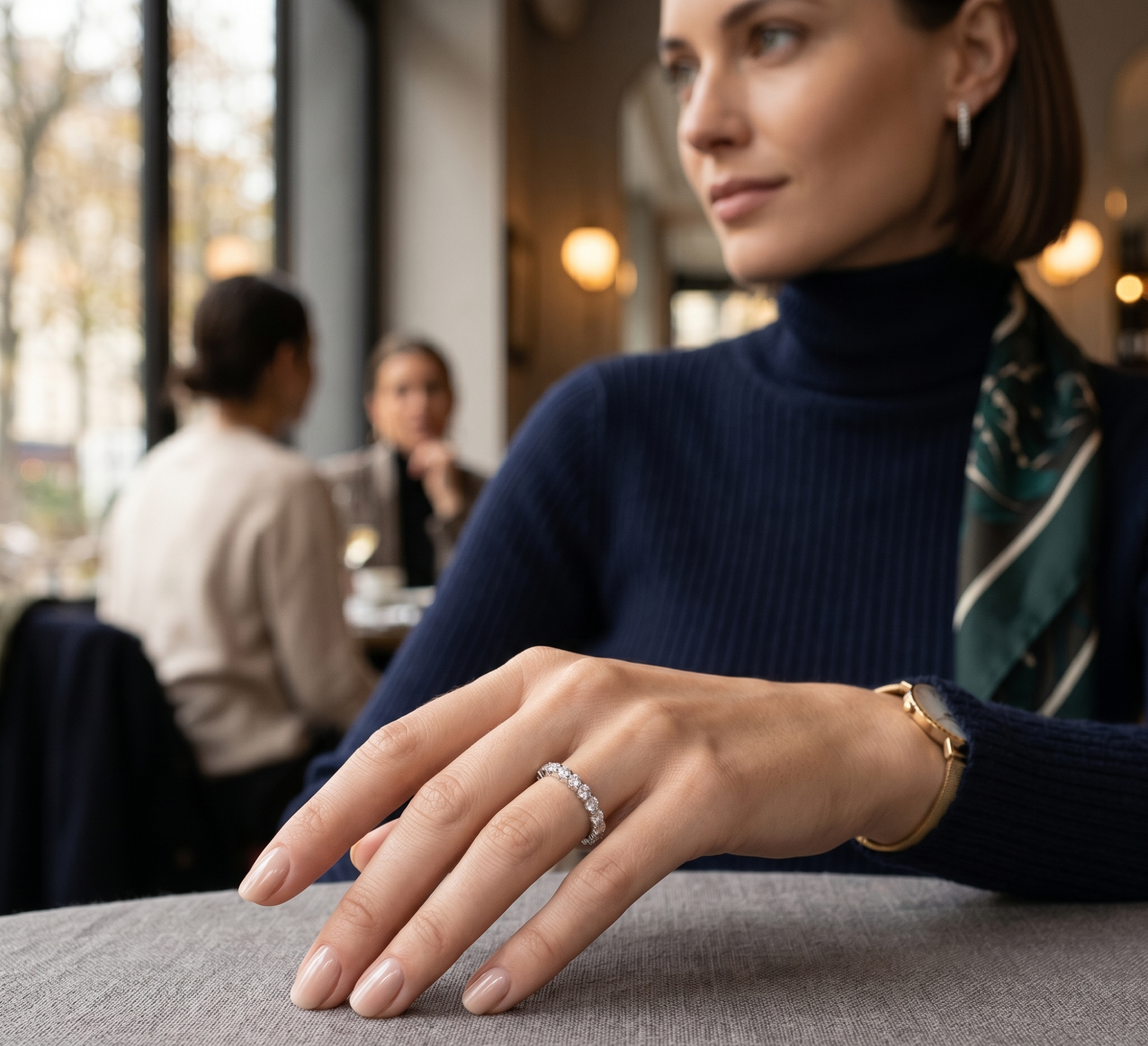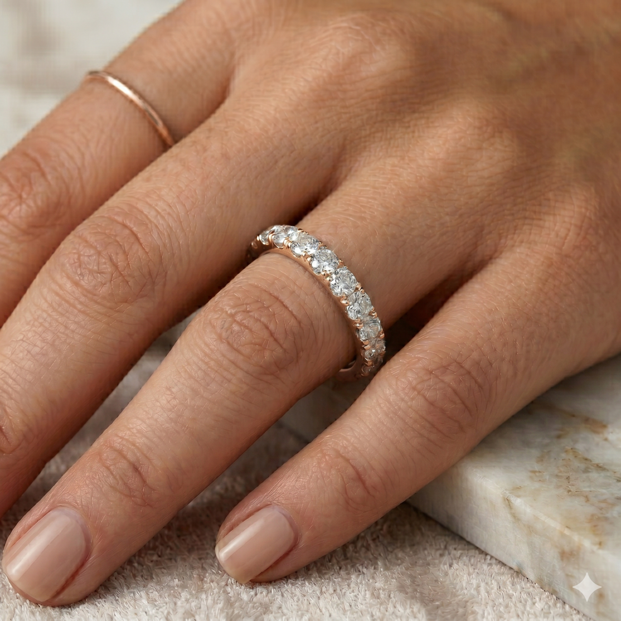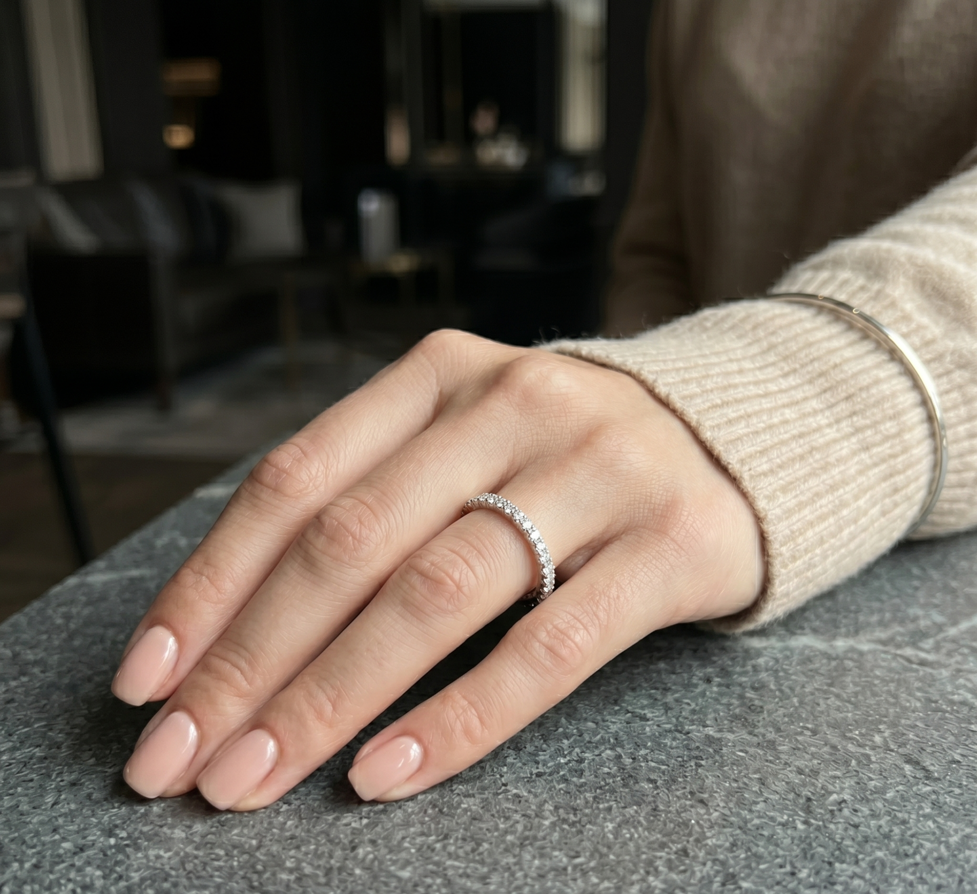 Deimantinė juostelė su laboratoriniais deimantais – žiedas su 1.05 karato deimantais. Nesvarbu, ar jau turite sužadėtuvių žiedą, ar vestuvinį žiedą – juos lengvai derinsite su deimantine juostele, kuri gali būti nešiojama ir kaip papildomas, ir kaip vienintelis žiedas.