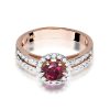 Raudono aukso sužadėtuvių žiedas su rubinu centre ir aplink jį spindinčiais natūraliais deimantais – tai modernus Halo dizainas, kuriame dera prabanga, elegancija ir ypatinga simbolinė akmens galia, nuo senų laikų siejama su meile, stiprybe ir džiaugsmu.