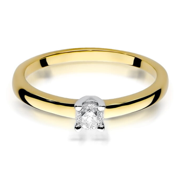 Sužadėtuvių žiedas iš geltono aukso su balto aukso karūnėle, kurioje spindi laboratorijoje užaugintas deimantas. Kontrastingas dizainas suteikia papuošalui ypatingo išskirtinumo ir elegancijos.