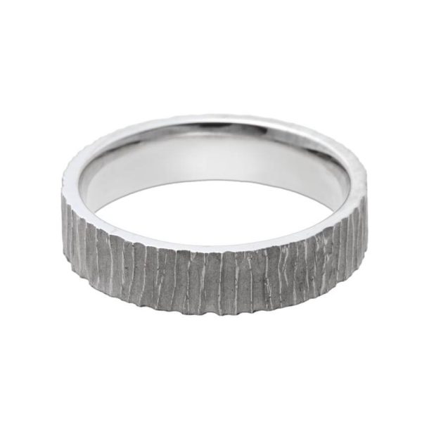Originalaus dizaino vestuvinis žiedas sukurtas „Fashion Gold“ juvelyrų primena medžio kamieną – baltas auksas yra išraižytas giliomis įpjovomis. Galime pasiūlyti tokio paties dizaino žiedą iš geltono ar raudono aukso.