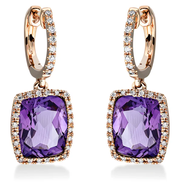 Prabangus, halo dizaino auskarai su anglišku užsiegimu su 6.30 ct ametistais stačiakampio formos ir deimantais aplink ametistą. Tinka kasdienai ir ypatingoms progoms, išskirtinam stiliui.