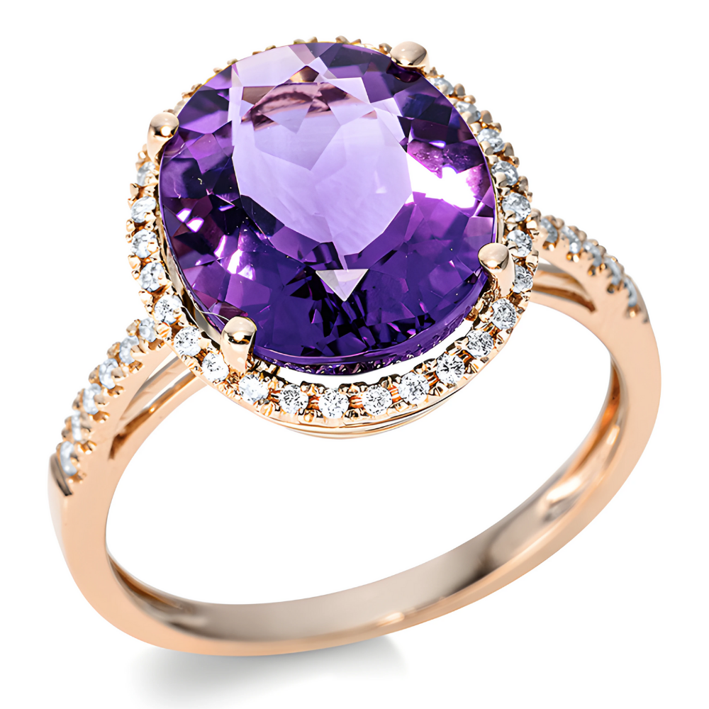 Prabangus, halo dizaino auksinis žiedas su ametistu ovalo formos ir deimantais aplink ametistą. Išskirtinis prabangus žiedas – stilingai moteriai.