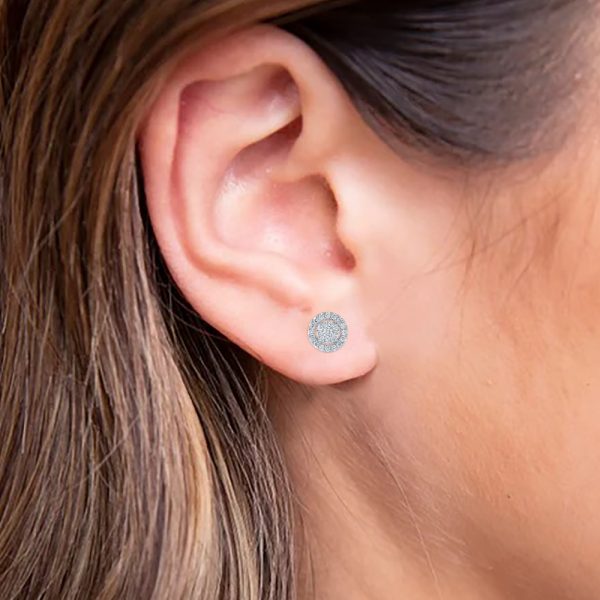 Halo dizaino auksiniai auskarai vinukai su deimantais, kuriu bendras svoris 0,50 karato. Tinka kasdienai ir ypatingoms progoms, išskirtinam stiliui.