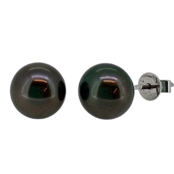 Balto aukso auskarai su jūriniais juodais perlais (Taičio, 10 mm)