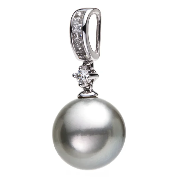Balto aukso pakabukas su juodu perlu ir princess deimantais (Taičio, 10.5 mm, 0.12 ct)