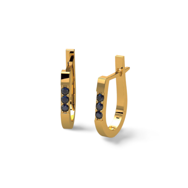 Aukso auskarai su mėlynais safyrais ir anglišku užsiegimu. Klasikinis auskarų transformatorių dizainas leidžia nešioti tik auskarus arba pridėti specialiai pagamintus pakabukus su brangakmeniais. Tinka kasdieniam nešiojimui arba ypatingoms progoms.