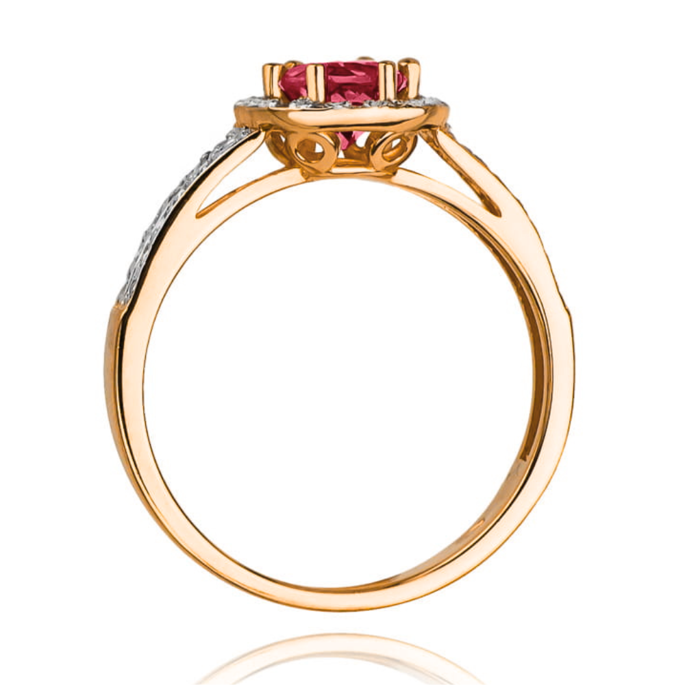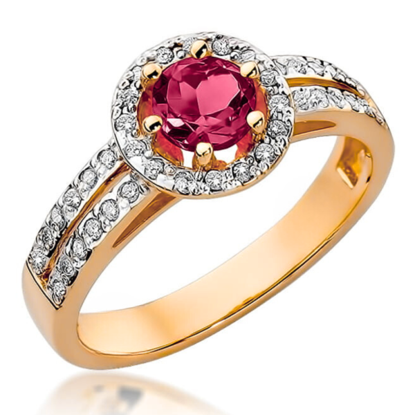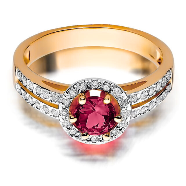 Prabangus Halo dizainas: apvalios formos rubinas apsuptas švytinčiais deimantais, su lankeliu iš dviejų linijų puoštu deimantais. Puikiai tinka sužadėtuvėms ir kasdienai, suteikia prabangą jūsų stilui.