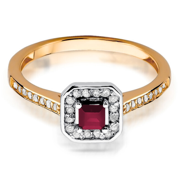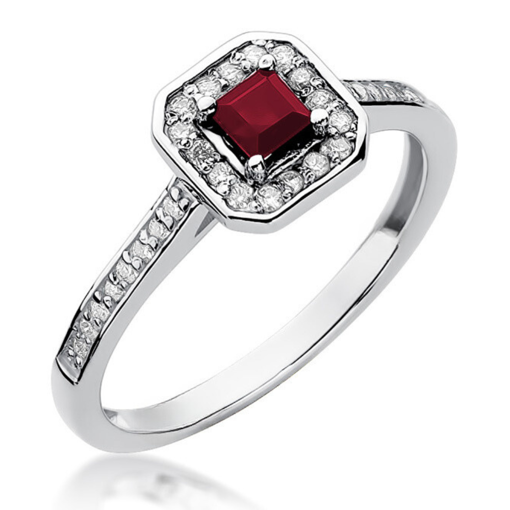 Halo sužadėtuvių žiedas su rubinu ir deimantais – Rubinas kvadratinis (0.36 ct)