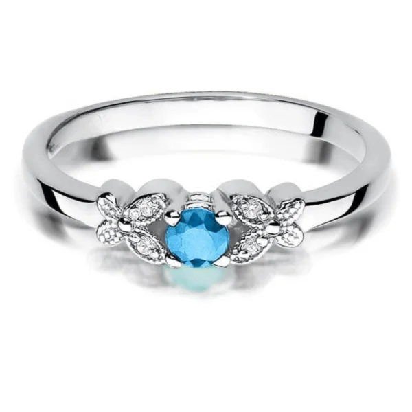Klasikinis sužadėtuvių žiedas su 0.10 karato apvalios formos topazu ir deimantais abiejose pusėse. Natūralūs deimantai.