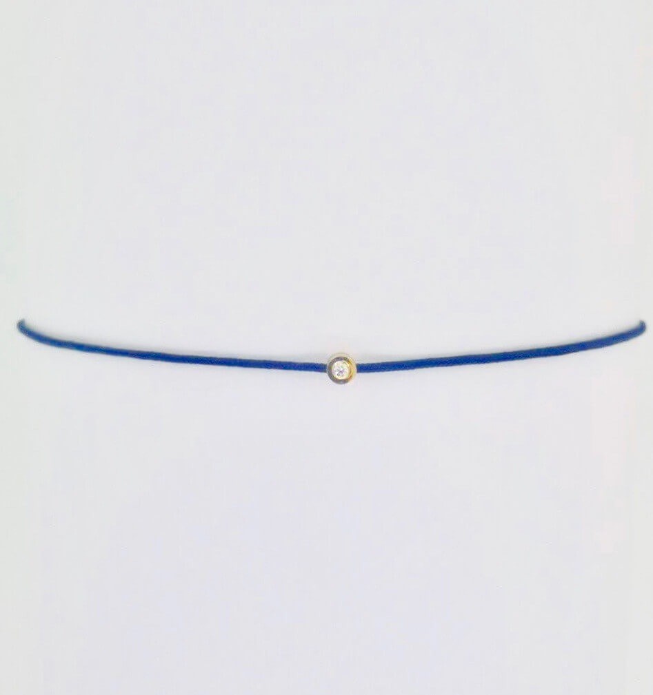 Mėlyno siūlo apyrankė su minimalistinė geltono aukso detalė ir natūraliu deimantu – ryškus derinys tarp spalvos, stiliaus ir elegancijos.