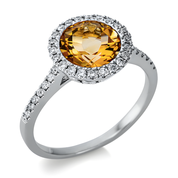 Modernaus dizaino balto aukso žiedas su apvalios formos citrinu ir deimantais. Išskirtinis žiedas – stilingai moteriai.