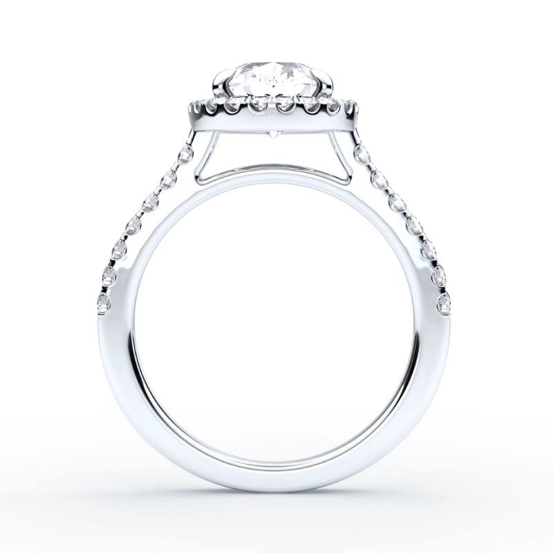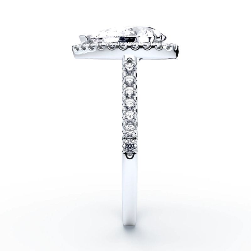Šis modernaus dizaino Halo sužadėtuvių žiedas yra skirtas tiems, kurie nori, kad jų sužadėtuvių simbolis būtų pastebimas. Bendras deimantų svoris – 2.30 ct, todėl šis sužadėtuvių žiedas pasižymi ryškiu spindesiu ir tvirta vizualine struktūra. Centrinis Pear pjūvio deimantas suteikia dizainui išskirtinumo. Lašo formos akmuo čia tampa ne tik puošmena, bet ir pagrindine dizaino ašimi.