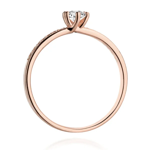 Rafinuotas raudono aukso sužadėtuvių žiedas su natūraliais deimantais, kurių bendras svoris 0,15 ct. Centrinį brangakmenį subtiliai papildo maži akmenėliai žiedo lankelyje, suteikdami papuošalui ypatingo spindesio. Puikus pasirinkimas romantiškai progai ar ilgam prisiminimui.