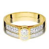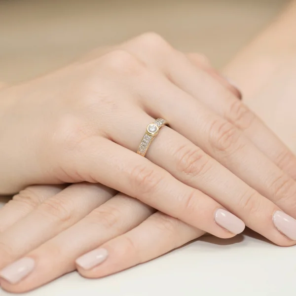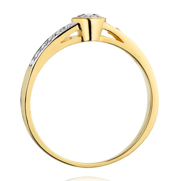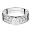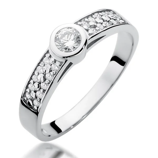 Modernus sužadėtuvių žiedas su deimantu, įtvirtintu į apvalią karūnėlę, ir apsuptas lankeliu su smulkiais deimantais iš abiejų pusių. Bendras deimantu svoris 0,35 karato. Patogus ir elegantiškas pasirinkimas sužadėtuvėms ir ypatingoms progoms. Aukščiausia žiedo kokybė. Maksimalus patogumas.