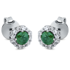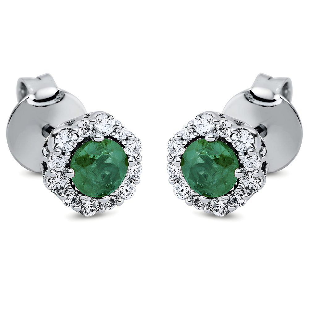 Klasikiniai auksiniai auskarai vinukai su smaragdais apvalios formos ir deimantais aplink smaragdą. Apvalios formos smaragdai – 0.40 ct