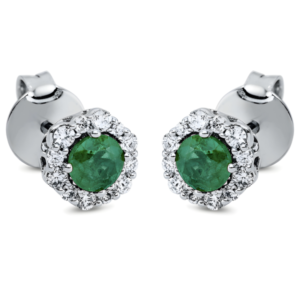 Klasikiniai auksiniai auskarai vinukai su smaragdais apvalios formos ir deimantais aplink smaragdą. Tinka kasdien ir ypatingoms progoms, išskirtinam stiliui.