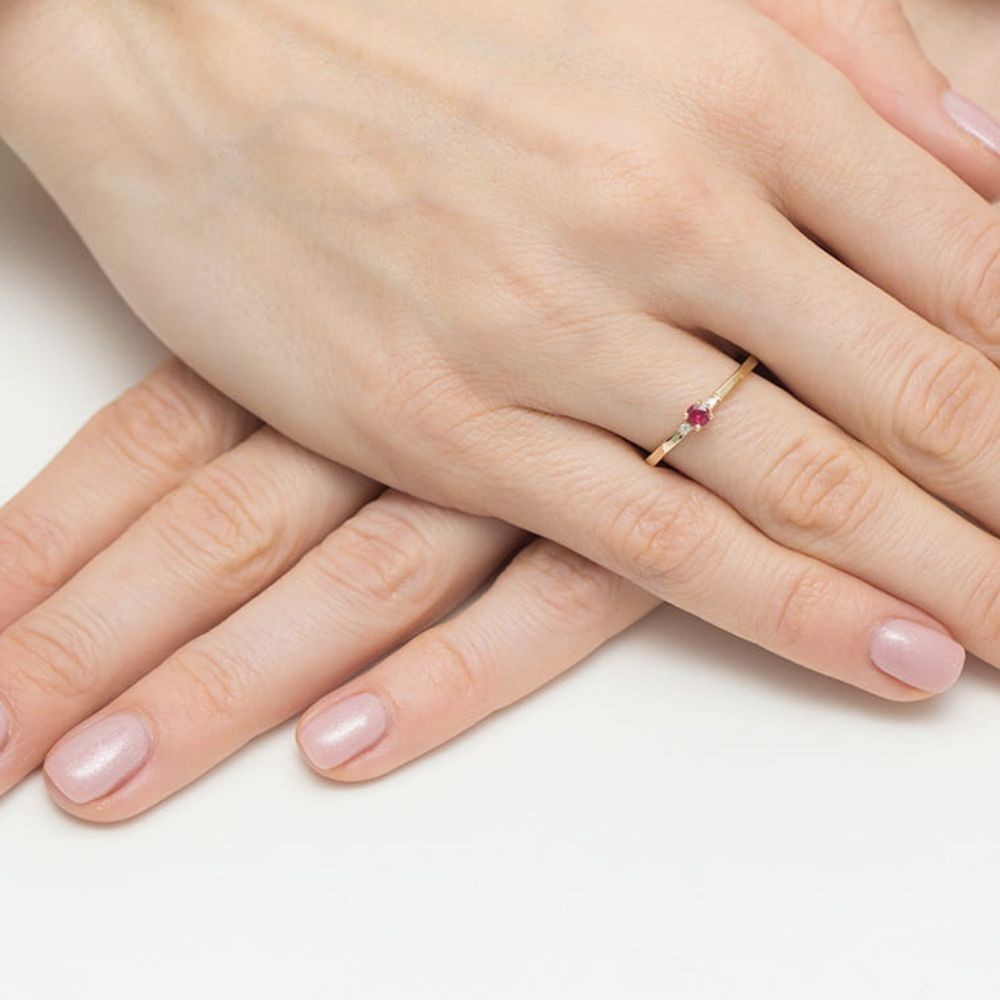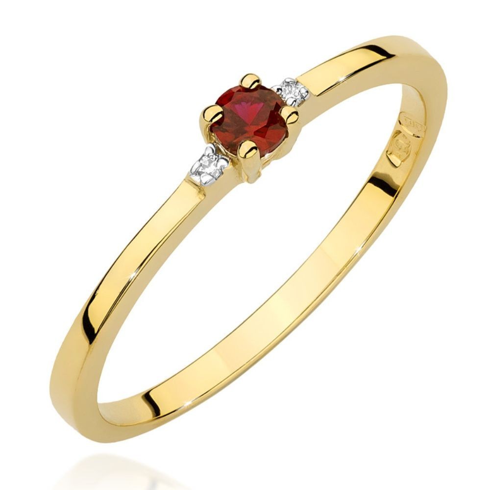 Rubinas – minimalistinis geltono aukso žiedas su rubinu ir deimantais (0,16 ct)