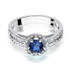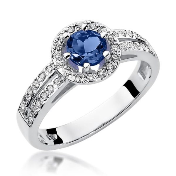 Prabangus Halo dizainas: apvalios formos safyras apsuptas švytinčiais deimantais, su lankeliu iš dviejų linijų puoštu deimantais. Idealiai tinka sužadėtuvėms, kasdienai ir ypatingoms progoms, suteikiant prabangos akcentą jūsų stilui.