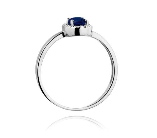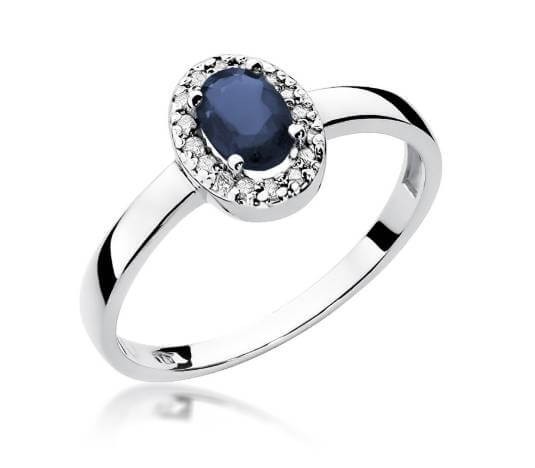 Spindintis balto aukso žiedas su safyru ir deimantais. Safyras ovalo formos, apjuostytas žėrinčiais deimantais. Klasikinis ir elegantiškas dizainas, puikus pasirinkimas sužadėtuvėms ir ypatingoms progoms