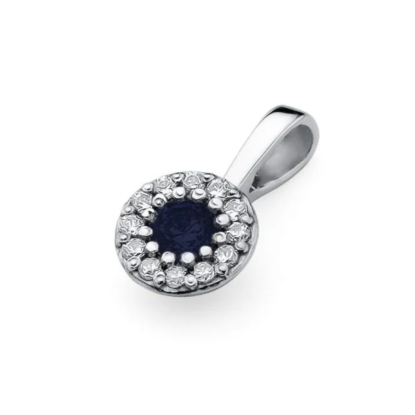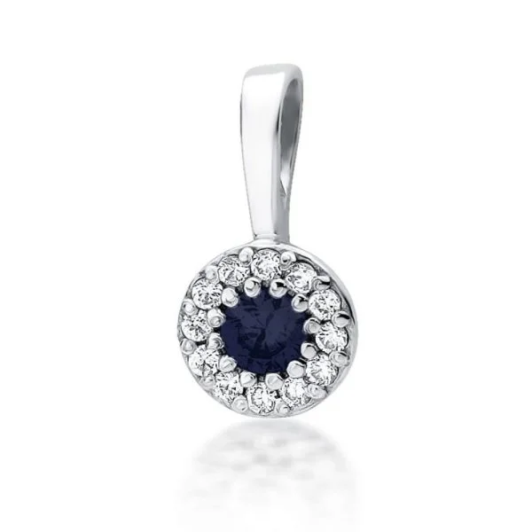 Halo dizaino balto aukso pakabukas su safyru ir žėrinčiais deimantais aplink. Puikus pasirinkimas kasdienai ir ypatingoms progoms.