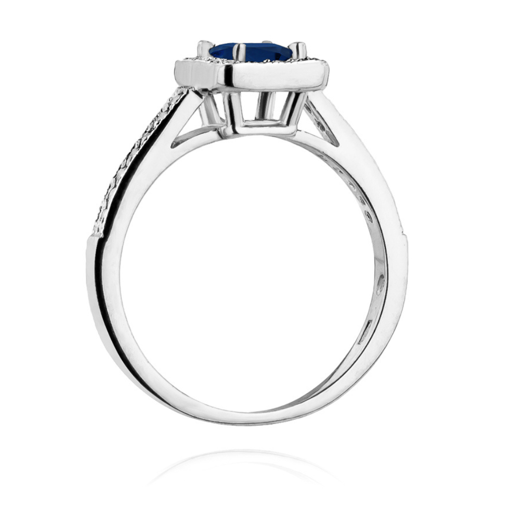 Halo dizaino sužadėtuvių žiedas su safyru ir deimantais. Safyras 0,š0 karato centre, deimantai sudėti aplink safyrą. Išskirtinis žiedas – stilingai moteriai. Puikiai tinka sužadėtuvėms ir kasdienai, suteikia prabangą jūsų stilui.