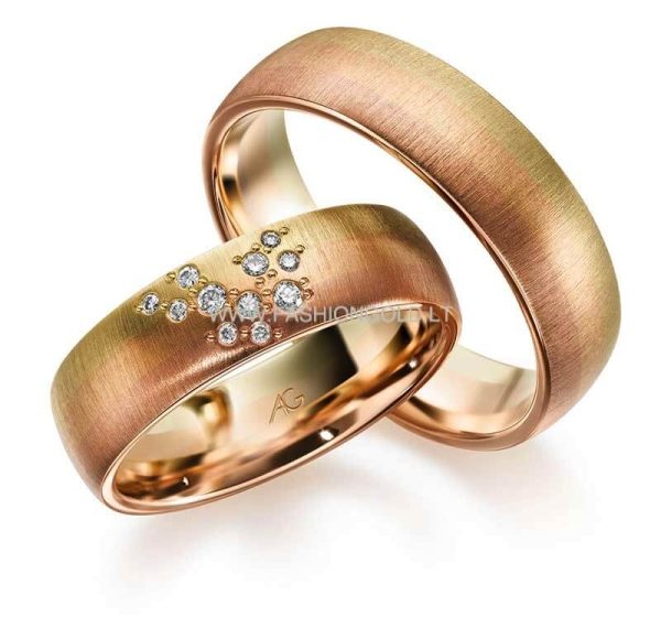 Įsižiūrėkite, šis žiedas ypatingas, nes jame pasteliniais perėjimais susijungia net trys aukso spalvos – raudona, rausva ir geltona. Kompanijos iš Vokietijos „Gerster“ kurti vestuviniai žiedai išsiskiria kokybe ir dizainu. Šį moterišką žiedą puošia 11 briliantų, kurių bendras svoris 0,08 karatus. Žiedo plotis – 6 mm.