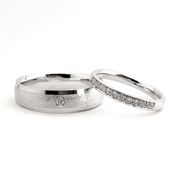 Auksiniai vestuviniai žiedai, spinduliuojantys galią, prabangą ir solidumą. Vyriškas vestuvinis žiedas su deimantu (0,03 ct) platus, masyvus, turintis išskirtinį gylu matinį paviršių. Moteriškas žiedas plonas, subtilus, elegantiškas, bet prabangus – už tai reikėtų dėkoti įspūdingiesiems briliantams (0,60 ct).