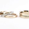 Žiedų komplektas moteriai leidžia turėti prabangų žiedą kiekviena gyvenimiška proga: į sporto klubą, prie vakarinės suknelės, kasdienai į darbą ir kt. Komplektą sudaro subtilūs, minimalistiniai auksiniai žiedai, prabanga alsuojanti deimantinė juostelė bei platus, masyvus žiedas. Gamybos trukmė 14 d.d., galime pagaminti skubos tvarka per 3 d.d.