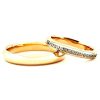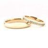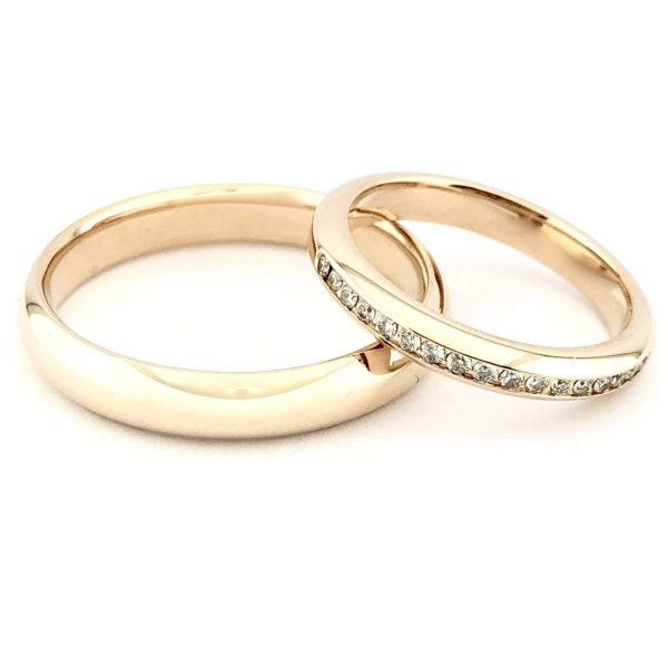 Raudono aukso vestuviniai žiedai, kuriuose susijungia klasika su prabanga. Vyriškas klasikinis žiedas įstabiai blizga, turi į išorę išgaubtą paviršių. Moteriškas vestuvinis žiedas mažesnių gabaritų, su briliantais. Toks klasikos ir briliantų prabangos junginys patiks visiems jaunavedžiams. Gamybos trukmė 14 d.d., galime pagaminti skubos tvarka per 3 d.d.