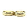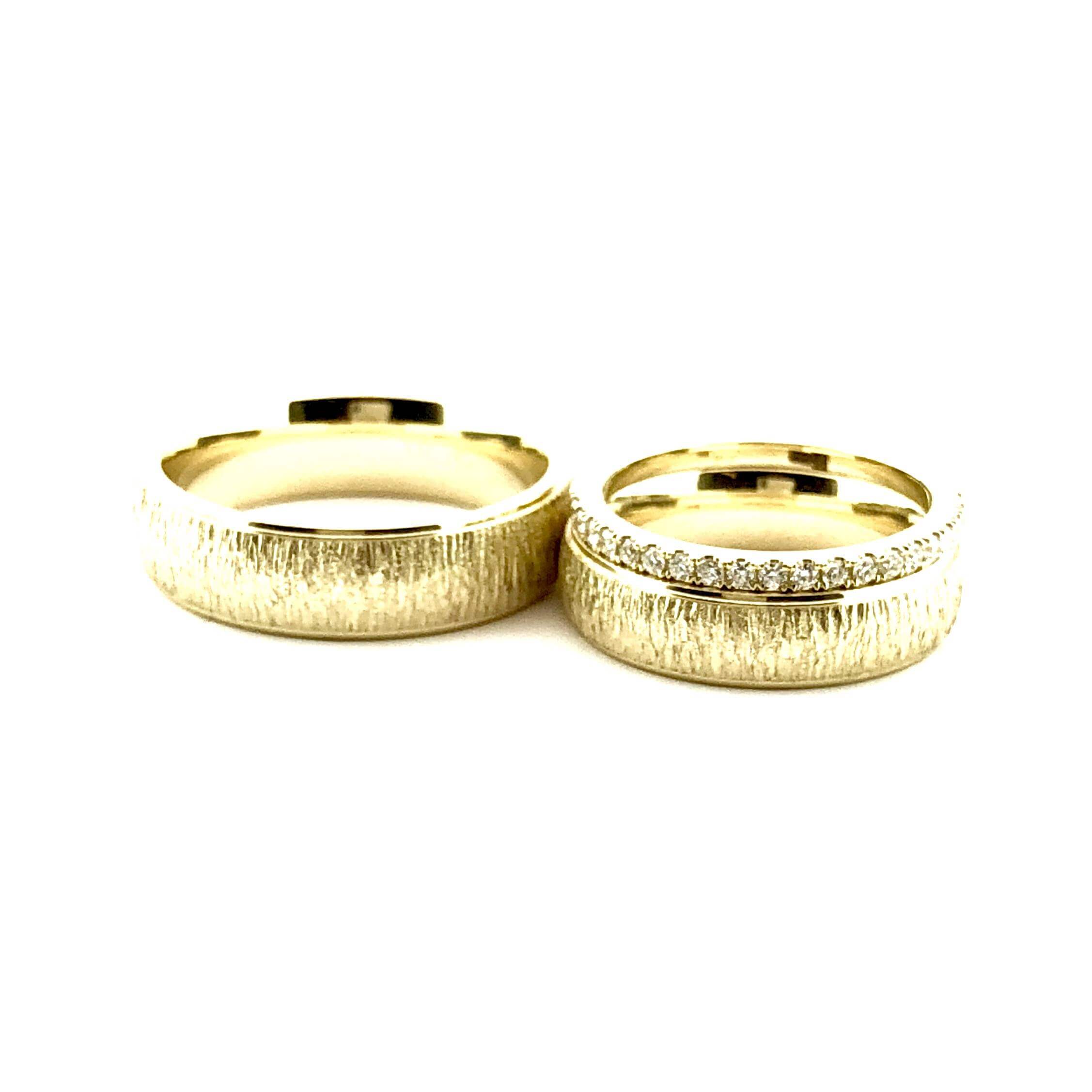 Platūs 5 mm ir 4 mm, rankų darbo, su komforto zona, šiurkštinto kalviško paviršiaus žiedai apjungia klasiką ir originalumą. Atskiras trečias moteriškas vestuvinis žiedas su briliantais (0,20 ct) – brangakmenių eilutė sukuria prabangos įspūdį. Vestuviniai žiedai Jam ir Jai. Gamybos trukmė 14 d.d., galime pagaminti skubos tvarka per 3 d.d.